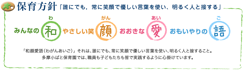 相手の意見に耳を傾けたり、相手の立場にたって考えたりするなどの思いやりのある行動・言動の中から信頼や愛情が育まれること、それは人が生きていく上でとても大切なことだということを子どもたちに伝えていきたいと思います。 多摩小ばと保育園の全職員が“誰にでも、常に笑顔で優しい言葉を使い、明るく人と接する”を実践し、保護者の方々・地域の方々など、子どもたちの身近にいる大人たちが豊かな人間関係の中で生活する姿を手本として示していくことが、これからの時代を担っていく子どもたちの幸せに繋がると信じて保育方針としています。 |